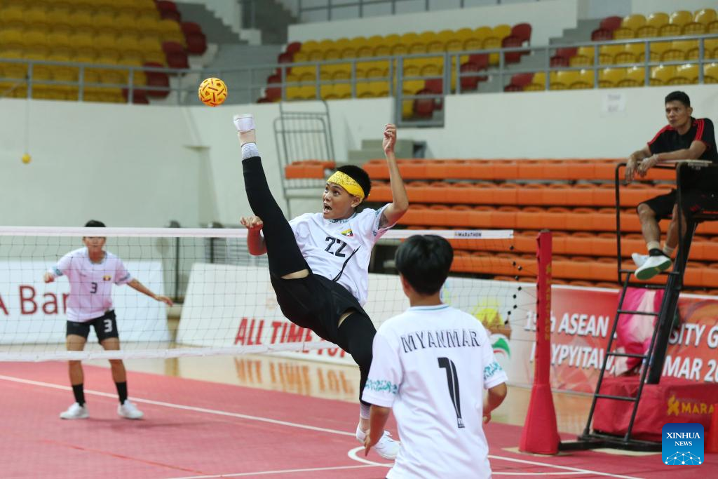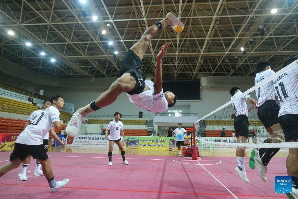 Members of Myanmar's national sepak takraw team attend a training session for the upcoming 19th Asian Games in Hangzhou at Wunna Theikdi Indoor Stadium in Nay Pyi Taw, Myanmar, Sept. 7, 2023. Myanmar will send 111 athletes to the 19th Asian Games in Hangzhou, China, an official from Myanmar's Ministry of Sports and Youth Affairs said. (Photo by Myo Kyaw Soe/ Xinhua)