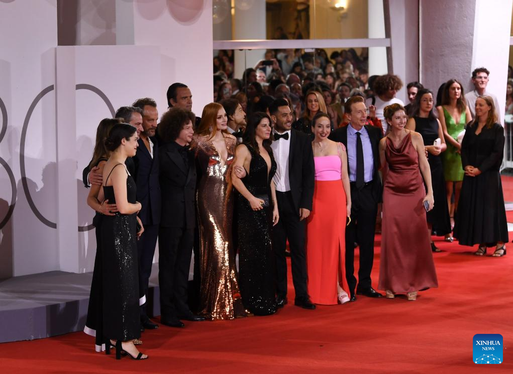 Crew members of the film Memory pose on the red carpet for the premiere during the 80th Venice International Film Festival in Venice, Italy, on Sept. 8, 2023. (Xinhua/Jin Mamengni)