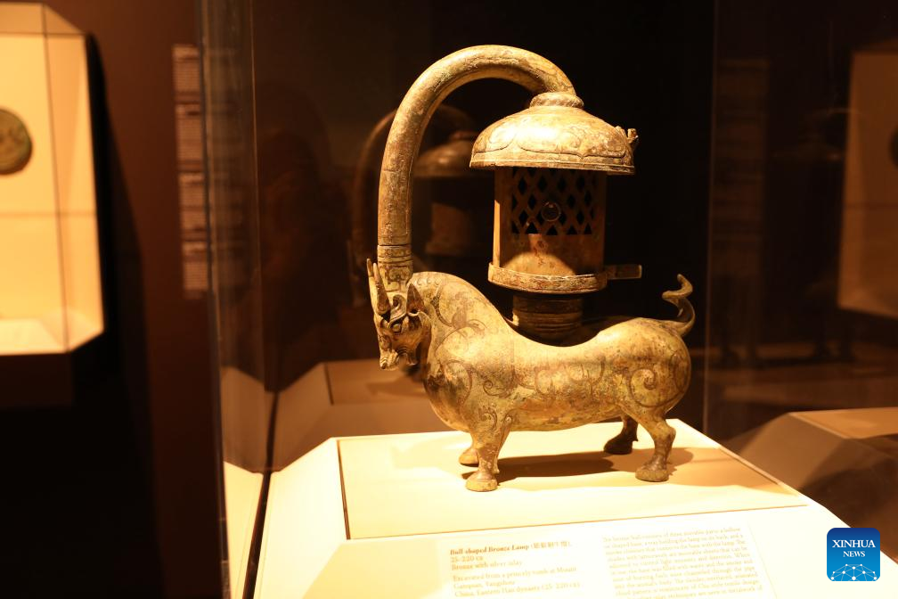 Photo taken on Sept. 6, 2023 shows a bull-shaped bronze lamp dating back to the Han Dynasty during an exhibition on treasures from China's Yangtze River Delta region at the Cleveland Museum of Art in Cleveland, Ohio, the United States. Grains of carbonized rice from about 10,000 years ago, together with over 200 other rare items, were exhibited in a show on treasures from China's Yangtze River Delta region at the Cleveland Museum of Art (CMA) in the U.S. state of Ohio. (Xinhua/Shi Chun)