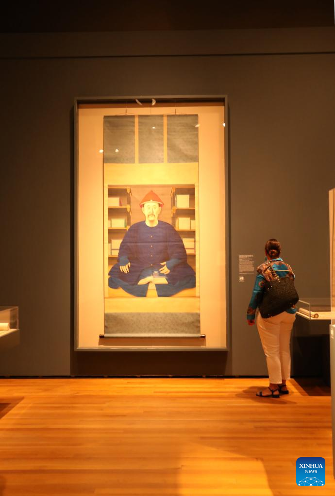 A visitor views a Chinese art exhibit during an exhibition on treasures from China's Yangtze River Delta region at the Cleveland Museum of Art in Cleveland, Ohio, the United States, on Sept. 6, 2023. Grains of carbonized rice from about 10,000 years ago, together with over 200 other rare items, were exhibited in a show on treasures from China's Yangtze River Delta region at the Cleveland Museum of Art (CMA) in the U.S. state of Ohio. (Xinhua/Shi Chun)