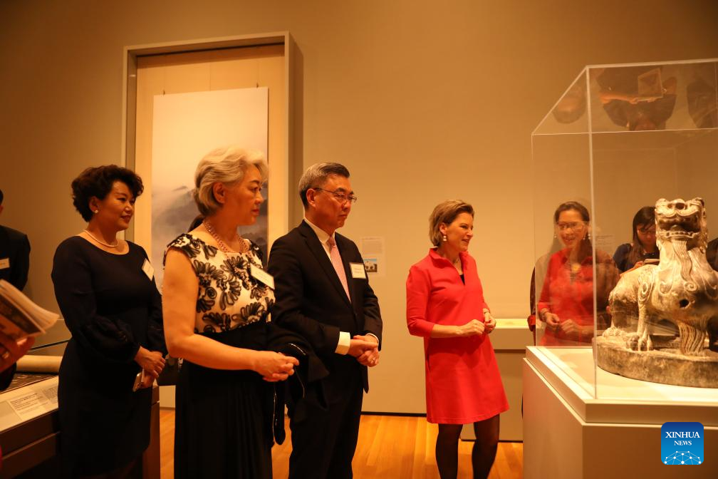 People talk in front of Chinese art exhibits during an exhibition on treasures from China's Yangtze River Delta region at the Cleveland Museum of Art in Cleveland, Ohio, the United States, on Sept. 6, 2023. Grains of carbonized rice from about 10,000 years ago, together with over 200 other rare items, were exhibited in a show on treasures from China's Yangtze River Delta region at the Cleveland Museum of Art (CMA) in the U.S. state of Ohio. (Xinhua/Shi Chun)