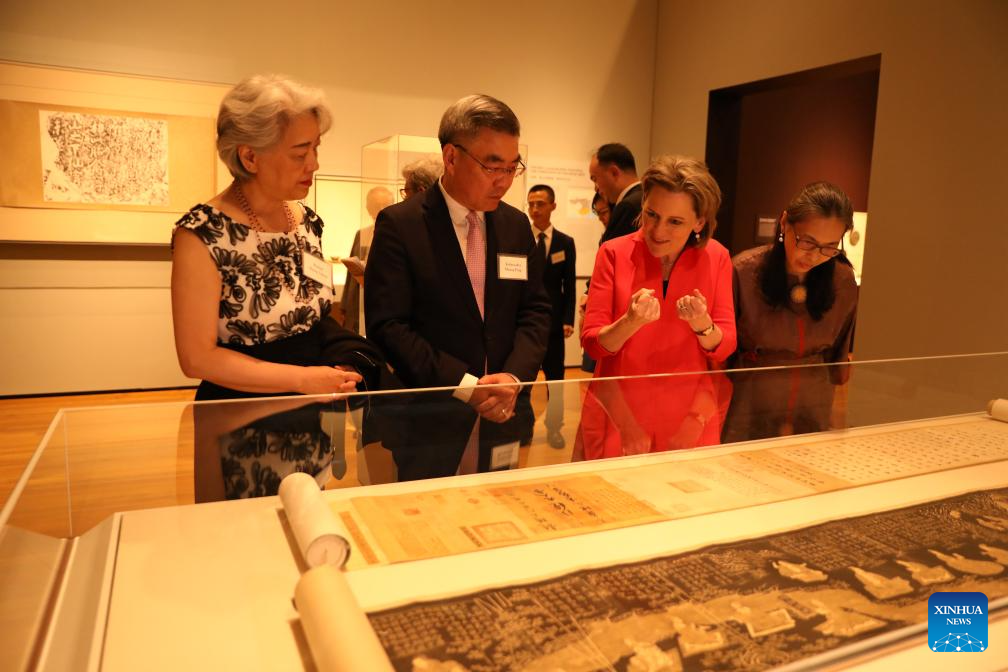 Chinese Consul General in New York Huang Ping (C) views an exhibit during an exhibition on treasures from China's Yangtze River Delta region at the Cleveland Museum of Art in Cleveland, Ohio, the United States, on Sept. 7, 2023. Grains of carbonized rice from about 10,000 years ago, together with over 200 other rare items, were exhibited in a show on treasures from China's Yangtze River Delta region at the Cleveland Museum of Art (CMA) in the U.S. state of Ohio. (Xinhua/Shi Chun)