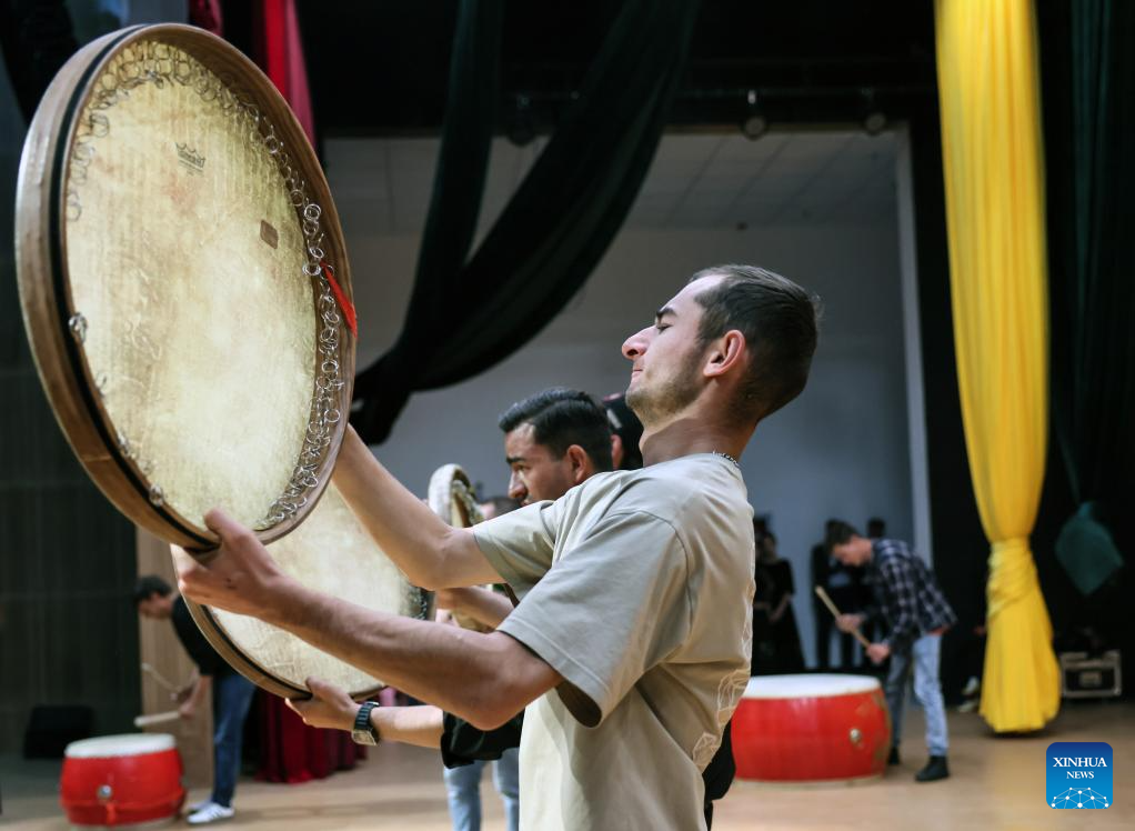 Artists of a local art troupe play the hand drum during a rehearsal in Taxkorgan Tajik Autonomous County, northwest China's Xinjiang Uygur Autonomous Region, Sept. 4, 2023. Taxkorgan Tajik Autonomous County has made great efforts in the integration of local culture and tourism in recent years, enriching the cultural life of people and promoting foreign exchanges. The county also carries forward traditional Chinese culture to build cultural tourism festivals, which shows the scenery of the Pamir Plateau and the happy and stable life of the people. (Xinhua/Hu Huhu)