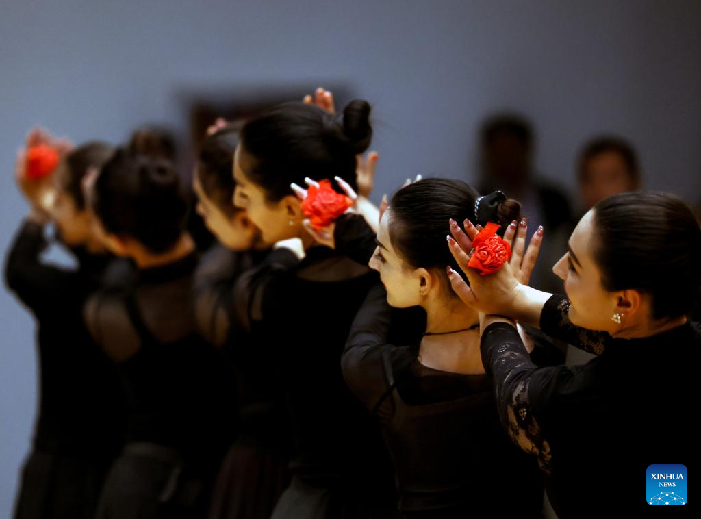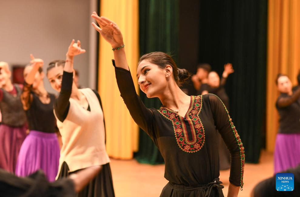 Artists of a local art troupe rehearse a dance in Taxkorgan Tajik Autonomous County, northwest China's Xinjiang Uygur Autonomous Region, Sept. 4, 2023. Taxkorgan Tajik Autonomous County has made great efforts in the integration of local culture and tourism in recent years, enriching the cultural life of people and promoting foreign exchanges. The county also carries forward traditional Chinese culture to build cultural tourism festivals, which shows the scenery of the Pamir Plateau and the happy and stable life of the people. (Xinhua/Wang Fei)