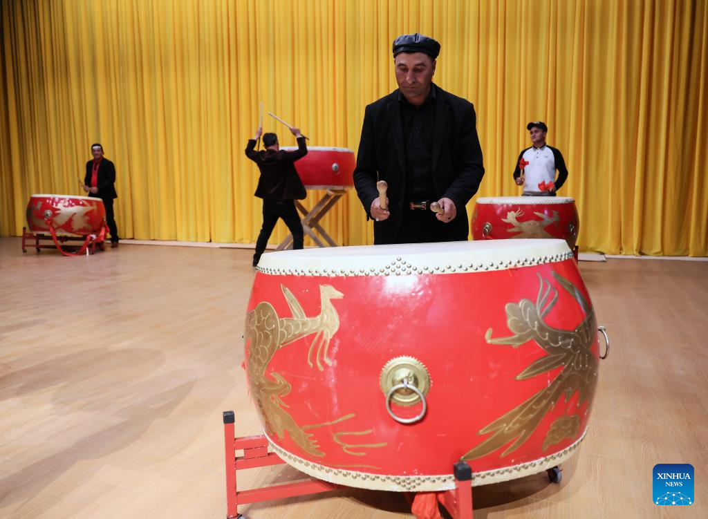 An artist of a local art troupe beats a drum during a rehearsal in Taxkorgan Tajik Autonomous County, northwest China's Xinjiang Uygur Autonomous Region, Sept. 4, 2023. Taxkorgan Tajik Autonomous County has made great efforts in the integration of local culture and tourism in recent years, enriching the cultural life of people and promoting foreign exchanges. The county also carries forward traditional Chinese culture to build cultural tourism festivals, which shows the scenery of the Pamir Plateau and the happy and stable life of the people. (Xinhua/Lan Hongguang)