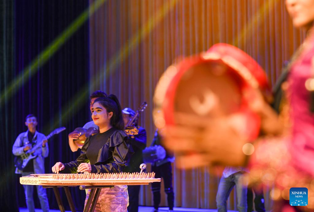 Artists of a local art troupe rehearse a program for a music festival in Taxkorgan Tajik Autonomous County, northwest China's Xinjiang Uygur Autonomous Region, Sept. 4, 2023. Taxkorgan Tajik Autonomous County has made great efforts in the integration of local culture and tourism in recent years, enriching the cultural life of people and promoting foreign exchanges. The county also carries forward traditional Chinese culture to build cultural tourism festivals, which shows the scenery of the Pamir Plateau and the happy and stable life of the people. (Xinhua/Lan Hongguang)