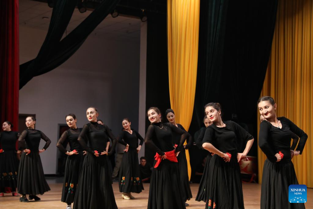 Artists of a local art troupe rehearse a program in Taxkorgan Tajik Autonomous County, northwest China's Xinjiang Uygur Autonomous Region, Sept. 4, 2023. Taxkorgan Tajik Autonomous County has made great efforts in the integration of local culture and tourism in recent years, enriching the cultural life of people and promoting foreign exchanges. The county also carries forward traditional Chinese culture to build cultural tourism festivals, which shows the scenery of the Pamir Plateau and the happy and stable life of the people. (Xinhua/Jin Haoyuan)