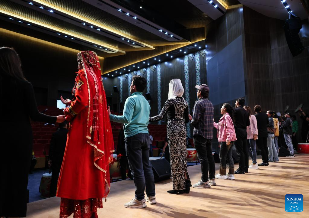 Artists of a local art troupe rehearse a program in Taxkorgan Tajik Autonomous County, northwest China's Xinjiang Uygur Autonomous Region, Sept. 7, 2023. Taxkorgan Tajik Autonomous County has made great efforts in the integration of local culture and tourism in recent years, enriching the cultural life of people and promoting foreign exchanges. The county also carries forward traditional Chinese culture to build cultural tourism festivals, which shows the scenery of the Pamir Plateau and the happy and stable life of the people. (Xinhua/Hu Huhu)