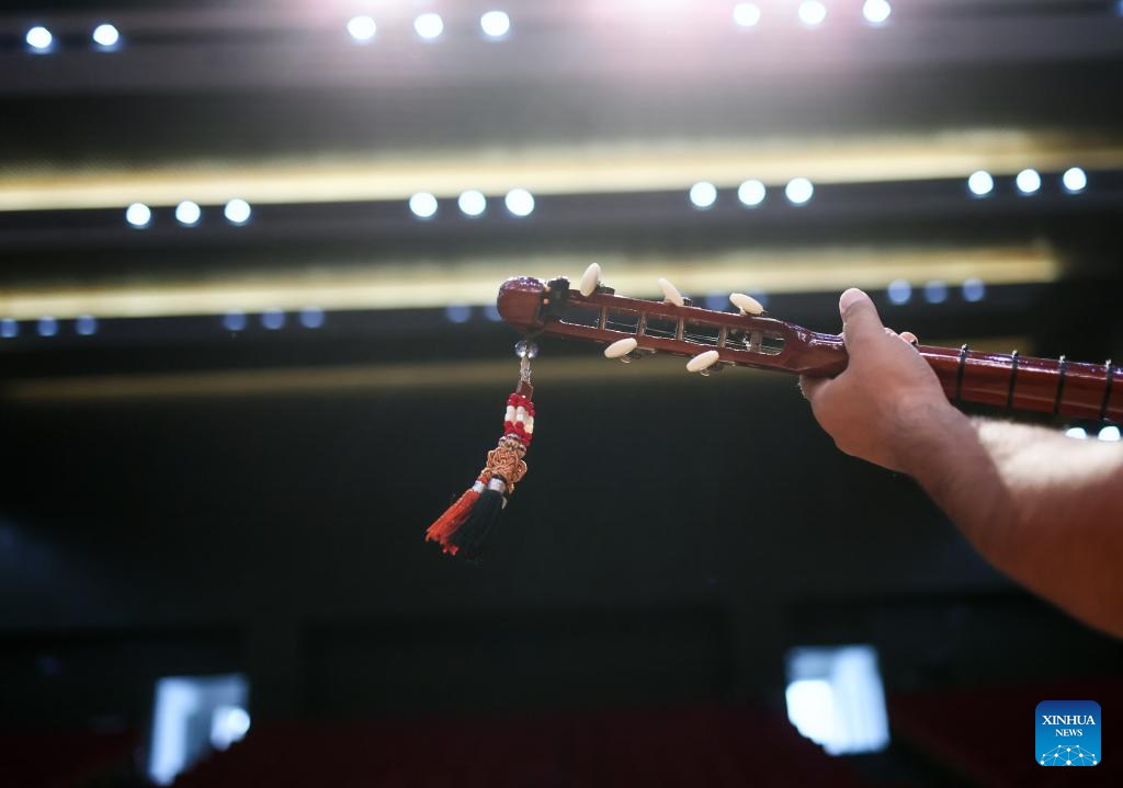 An artist of a local art troupe plays the traditional instrument during a rehearsal in Taxkorgan Tajik Autonomous County, northwest China's Xinjiang Uygur Autonomous Region, Sept. 4, 2023. Taxkorgan Tajik Autonomous County has made great efforts in the integration of local culture and tourism in recent years, enriching the cultural life of people and promoting foreign exchanges. The county also carries forward traditional Chinese culture to build cultural tourism festivals, which shows the scenery of the Pamir Plateau and the happy and stable life of the people. (Xinhua/Wang Fei)