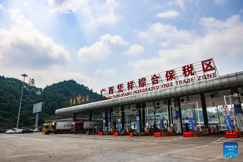Trucks loaded with goods from ASEAN countries enter the Pingxiang Integrated Free Trade Zone in Pingxiang, south China's Guangxi Zhuang Autonomous Region, May 19, 2023.