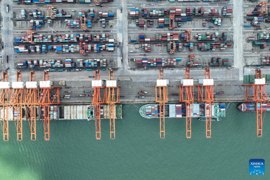 This aerial photo taken on July 22, 2023 shows an automated container wharf of the Beibu Gulf Port in Qinzhou, south China's Guangxi Zhuang Autonomous Region.