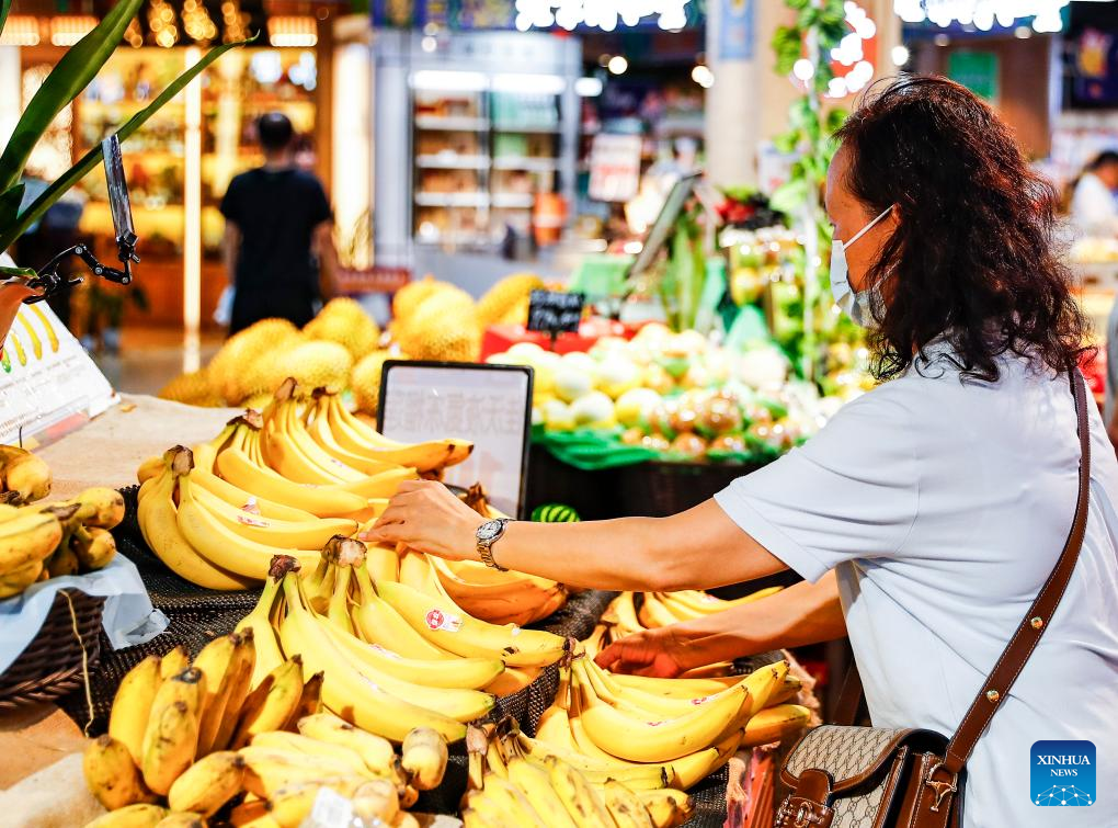 A woman chooses bananas imported from the Philippines at a supermarket in Nanning, south China's Guangxi Zhuang Autonomous Region, Sept. 7, 2023.
