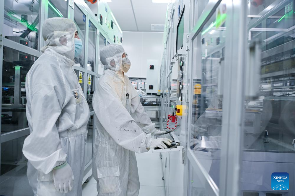 Staff members operate intelligent production equipment at a workshop of SVOLT Energy Technology Co., Ltd. in Yancheng, east China's Jiangsu Province, Sept. 8, 2023. Yancheng has boosted green and low-carbon development by advancing new energy industries such as wind and photovoltaic power in recent years. (Xinhua/Li Bo)