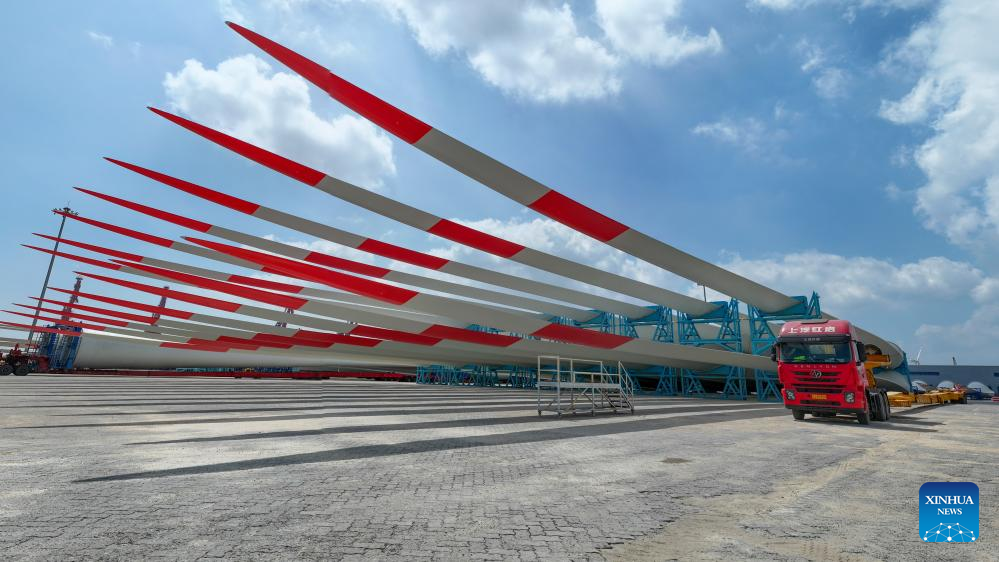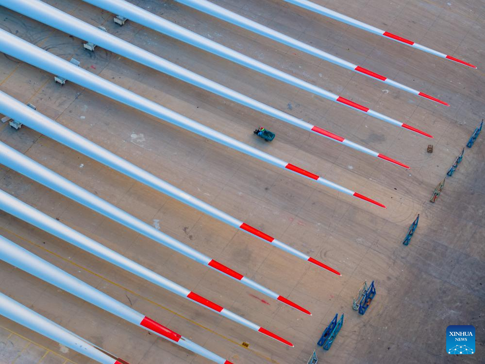 This aerial photo taken on Sept. 7, 2023 shows wind turbine blades at a port in Yancheng, east China's Jiangsu Province. Yancheng has boosted green and low-carbon development by advancing new energy industries such as wind and photovoltaic power in recent years. (Xinhua/Li Bo)