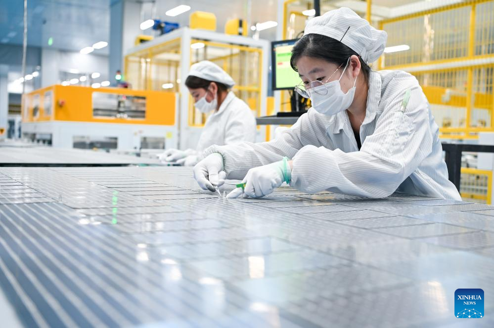 Staff members work at a workshop of a photovoltaic technology company in Yancheng, east China's Jiangsu Province, Sept. 6, 2023. Yancheng has boosted green and low-carbon development by advancing new energy industries such as wind and photovoltaic power in recent years. (Xinhua/Li Bo)