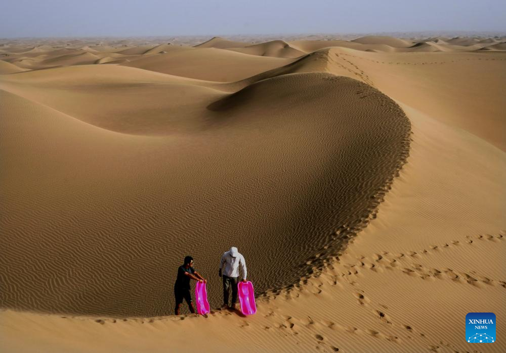 Tourists get ready to slide down a sand dune in a desert scenic spot in Makit County of Kashgar, northwest China's Xinjiang Uygur Autonomous Region, Sept. 7, 2023. Makit County, located on the southwestern rim of the Taklimakan Desert, has taken advantage of its natural resources to develop tourism and provide jobs for the local people. (Xinhua/Li An)