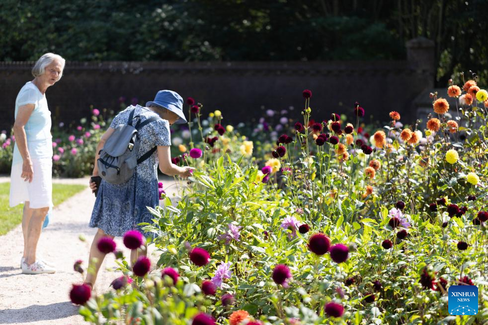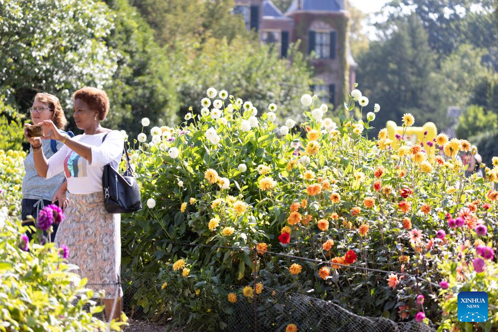 People enjoy dahlias at the garden of Keukenhof Castle in Lisse, the Netherlands, Sept. 9, 2023. The Holland Dahlia Event 2023 is held from Sept. 8 to 10. (Photo by Sylvia Lederer/Xinhua)