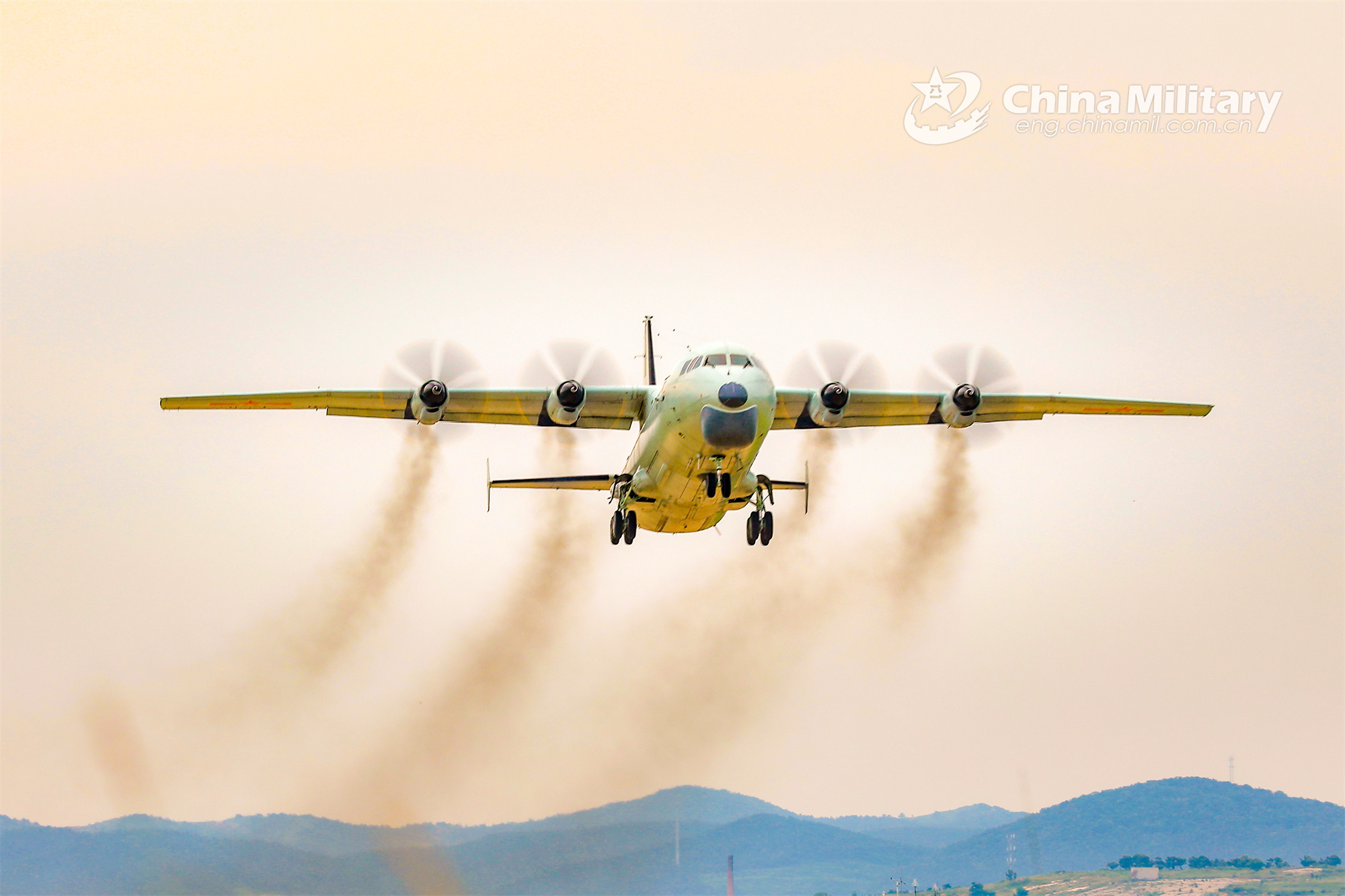 An anti-submarine aircraft attached to a naval aviation unit under the PLA Northern Theater Command takes off and heads to designated airspace during a multi-subject training exercise held in August 15, 2023. (eng.chinamil.com.cn/Photo by Bu Lingbin)