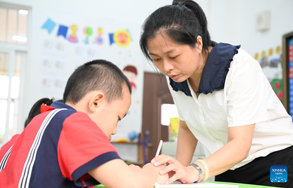 Fu Yaohui (R) helps as a student writes at Hainan (Haikou) Special School in Haikou, south China's Hainan Province, Sept. 6, 2023. (Xinhua/Yang Guanyu)