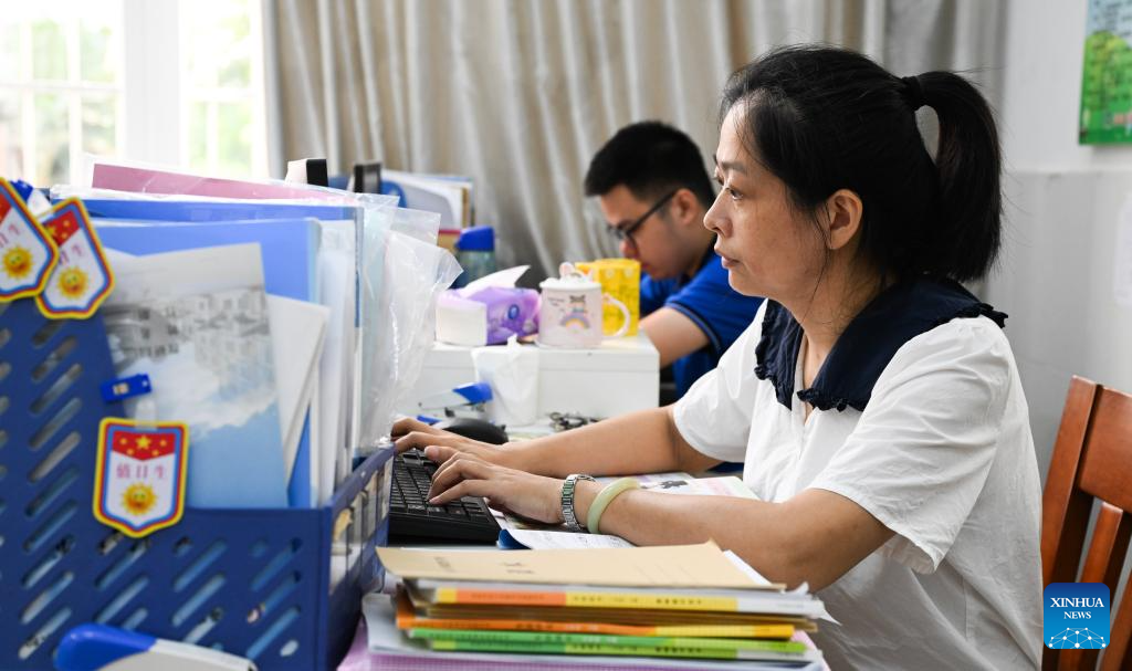 Fu Yaohui (C) talks with a student's parent after class at Hainan (Haikou) Special School in Haikou, south China's Hainan Province, Sept. 5, 2023. (Xinhua/Yang Guanyu)