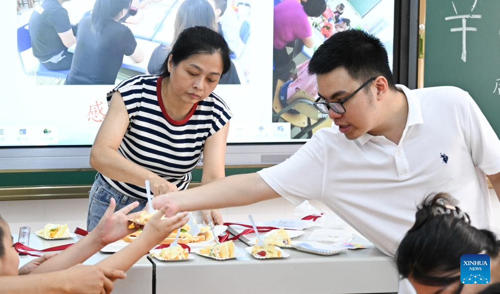 Fu Yaohui (L) and her colleague Meng Fan distribute cakes to students and their families at Hainan (Haikou) Special School in Haikou, south China's Hainan Province, Sept. 8, 2023. (Xinhua/Yang Guanyu)