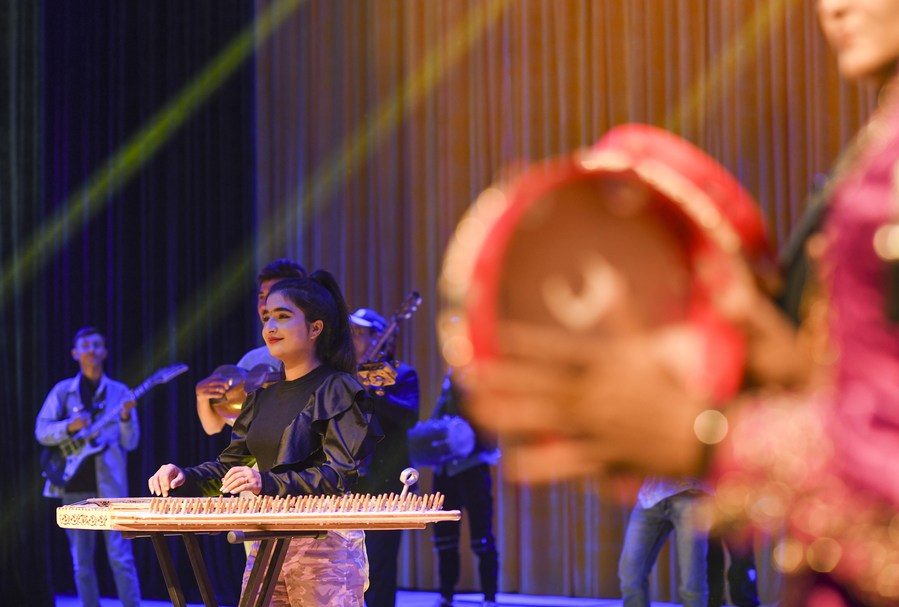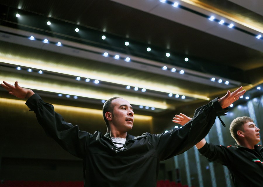 Artists of a local art troupe rehearse a program in Taxkorgan Tajik Autonomous County, northwest China's Xinjiang Uygur Autonomous Region, Sept. 7, 2023. (Xinhua/Hu Huhu)