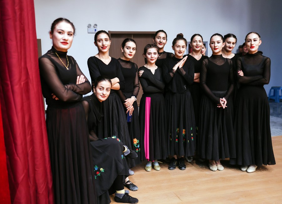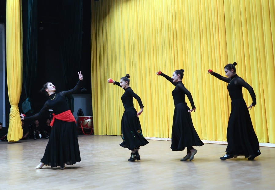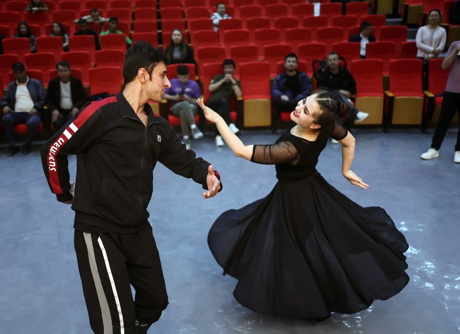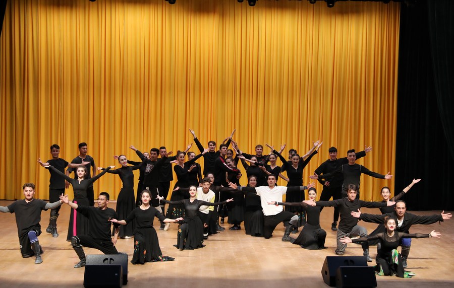 Artists of a local art troupe rehearse a dance in Taxkorgan Tajik Autonomous County, northwest China's Xinjiang Uygur Autonomous Region, Sept. 4, 2023. (Xinhua/Wang Fei)