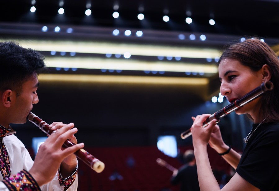 Artists of a local art troupe rehearse a program for a music festival in Taxkorgan Tajik Autonomous County, northwest China's Xinjiang Uygur Autonomous Region, Sept. 4, 2023. (Xinhua/Lan Hongguang)