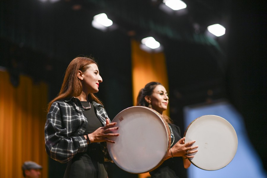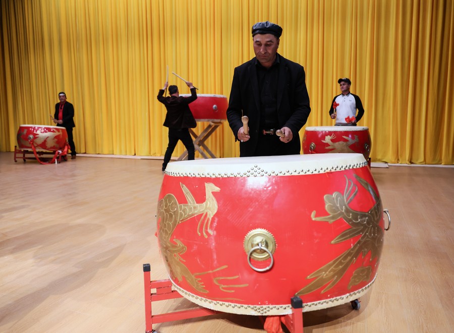 Artists of a local art troupe play the hand drums during a rehearsal in Taxkorgan Tajik Autonomous County, northwest China's Xinjiang Uygur Autonomous Region, Sept. 4, 2023. (Xinhua/Hu Huhu)