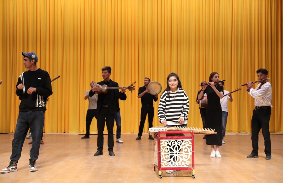 Artists of a local art troupe rehearse a program in Taxkorgan Tajik Autonomous County, northwest China's Xinjiang Uygur Autonomous Region, Sept. 4, 2023. (Xinhua/Jin Haoyuan)