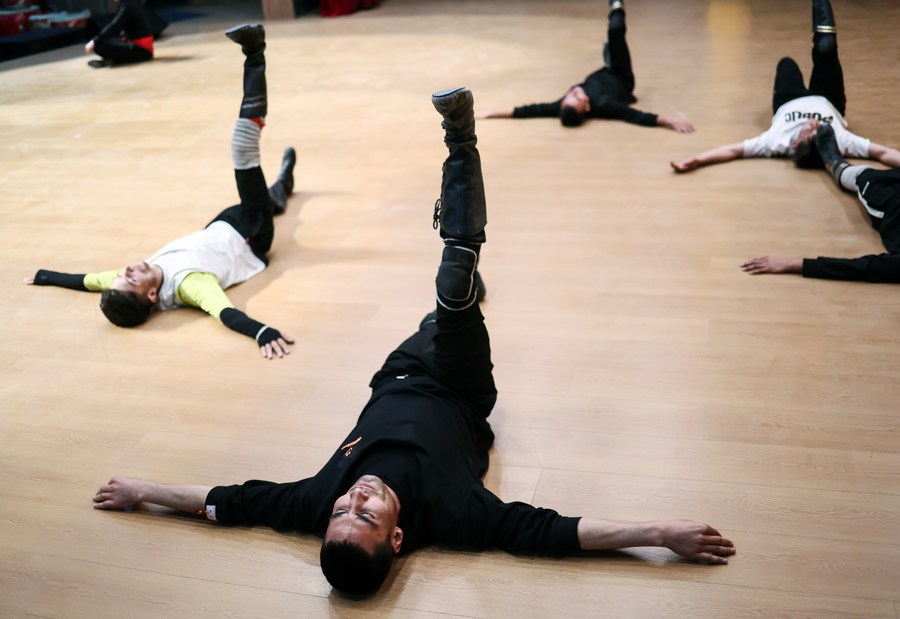 Artists of a local art troupe rehearse an acrobatic show in Taxkorgan Tajik Autonomous County, northwest China's Xinjiang Uygur Autonomous Region, Sept. 4, 2023. (Xinhua/Lan Hongguang)