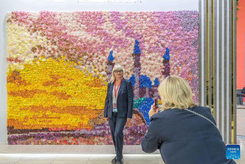 A woman poses for photo at an exhibition area of the 8th Eastern Economic Forum in Vladivostok, Russia, Sept. 10, 2023. The Russian Far East city of Vladivostok welcomed thousands of participants for the 8th Eastern Economic Forum (EEF) on Sunday to promote economic and cultural exchanges among the regions of the Asia-Pacific. The four-day event is organized by the Roscongress Foundation. (Photo by Guo Feizhou/Xinhua)