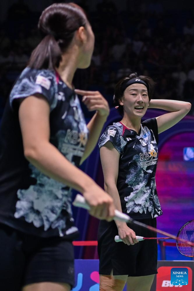 Baek Ha Na/Lee So Hee (R) of South Korea react during the women's doubles final between Chen Qingchen/Jia Yifan of China and Baek Ha Na/Lee So Hee of South Korea at the 2023 China Open badminton tournament in Changzhou, east China's Jiangsu Province, Sept. 10, 2023. (Xinhua/Li Bo)