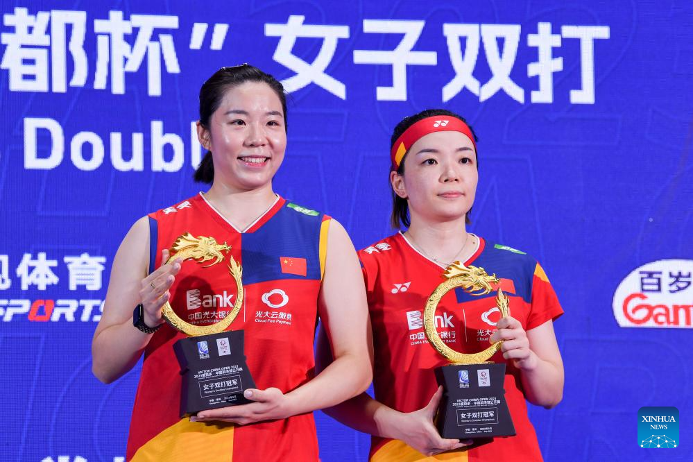 Gold medalists Chen Qingchen/Jia Yifan (L) of China pose during the awarding ceremony after the women's doubles final between Chen Qingchen/Jia Yifan of China and Baek Ha Na/Lee So Hee of South Korea at the 2023 China Open badminton tournament in Changzhou, east China's Jiangsu Province, Sept. 10, 2023. (Xinhua/Li Bo)