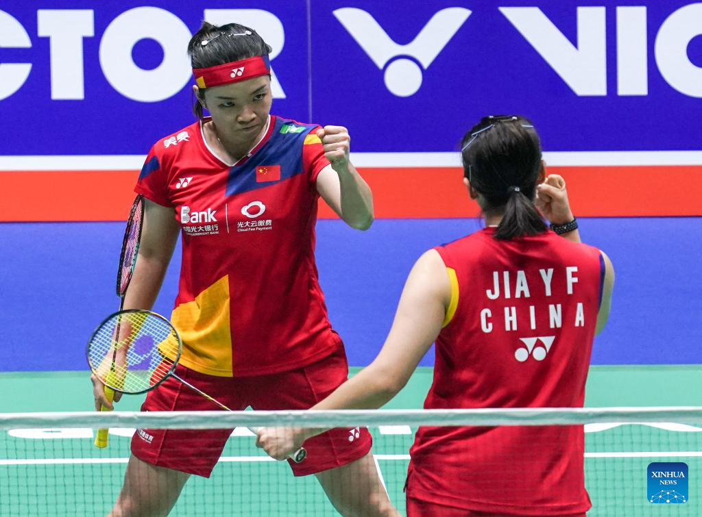 Chen Qingchen (R)/Jia Yifan of China react during the women's doubles final between Chen Qingchen/Jia Yifan of China and Baek Ha Na/Lee So Hee of South Korea at the 2023 China Open badminton tournament in Changzhou, east China's Jiangsu Province, Sept. 10, 2023. (Xinhua/Li Bo)