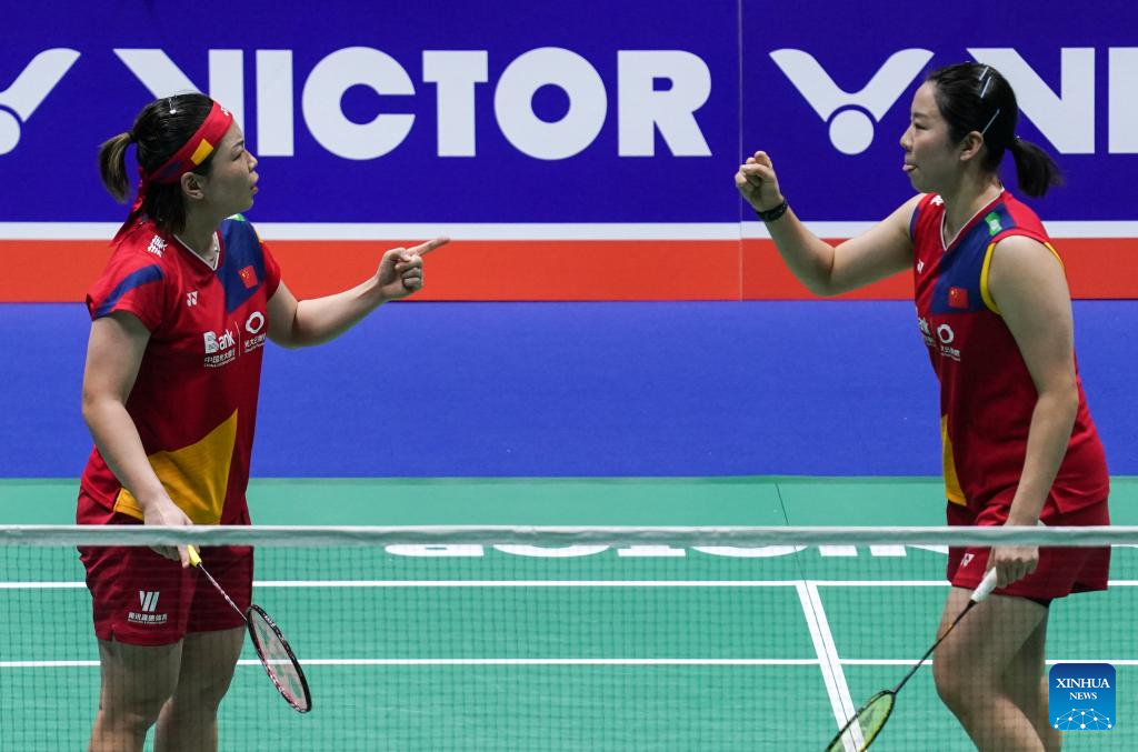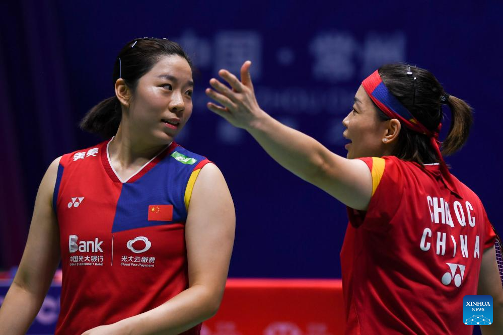 Chen Qingchen/Jia Yifan (R) of China react during the women's doubles final between Chen Qingchen/Jia Yifan of China and Baek Ha Na/Lee So Hee of South Korea at the 2023 China Open badminton tournament in Changzhou, east China's Jiangsu Province, Sept. 10, 2023. (Xinhua/Li Bo)