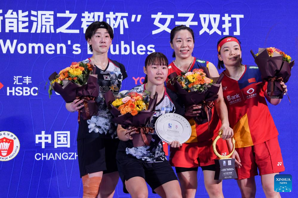 Gold medalists Chen Qingchen (1st R)/Jia Yifan (2nd R) of China and silver medalists Baek Ha Na (2nd L)/Lee So Hee of South Korea pose during the awarding ceremony after the women's doubles final between Chen Qingchen/Jia Yifan of China and Baek Ha Na/Lee So Hee of South Korea at the 2023 China Open badminton tournament in Changzhou, east China's Jiangsu Province, Sept. 10, 2023. (Xinhua/Li Bo)