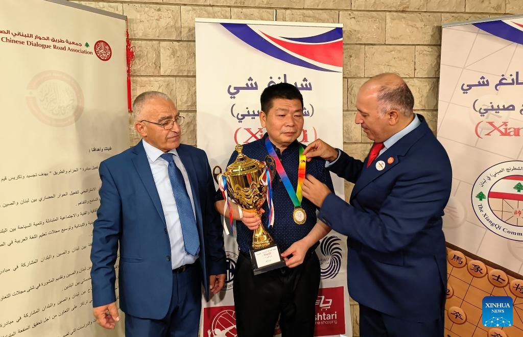 Chinese participant Li Lei (C) is awarded after winning the first place of Lebanese-Chinese XiangQi Friendship Championship in Deir el Qamar, Mount Lebanon Governorate, Lebanon, on Sept. 10, 2023. A competition for Chinese chess, called XiangQi, organized by the XiangQi Committee in Lebanon, was held on Sunday in Deir el Qamar, a historic town in southern-central Lebanon, attracting about 70 Lebanese and Chinese fans of all ages. (Photo by Huang Shuai/Xinhua)