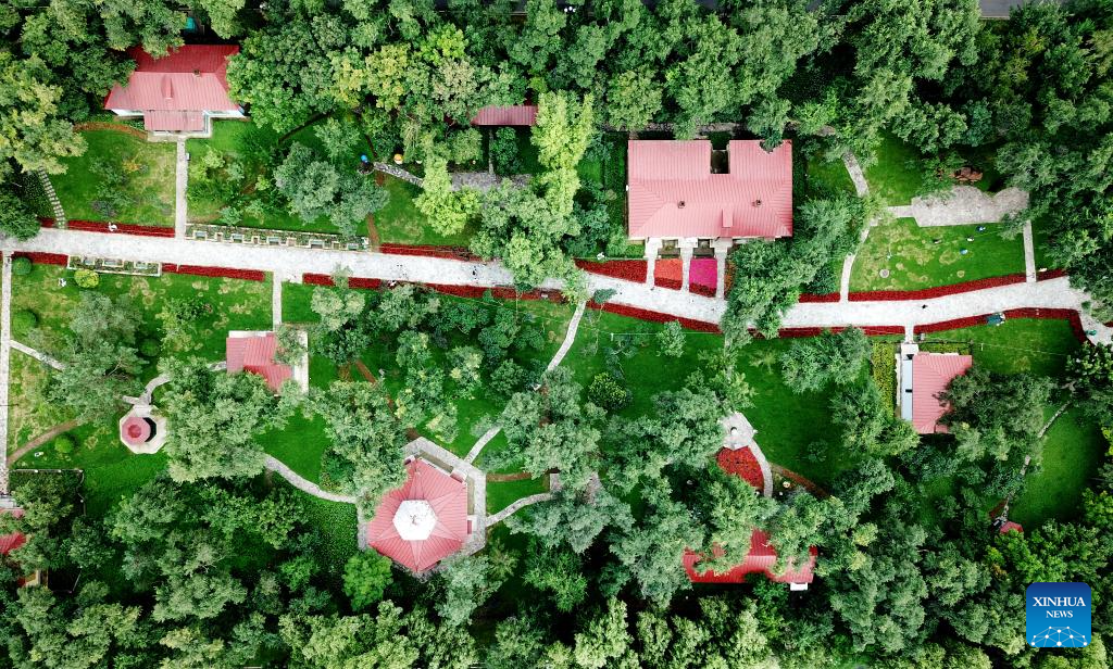 This aerial photo taken on Aug. 3, 2023 shows an European-style building at Sun Island scenic spot in Harbin, northeast China's Heilongjiang Province. Situated on the northern bank of the Songhua River in Harbin City, Sun Island scenic spot offers a multifunctional landscape that combines European-style architecture, rural scenery, folk culture, and ice and snow culture. (Xinhua/Wang Jianwei)