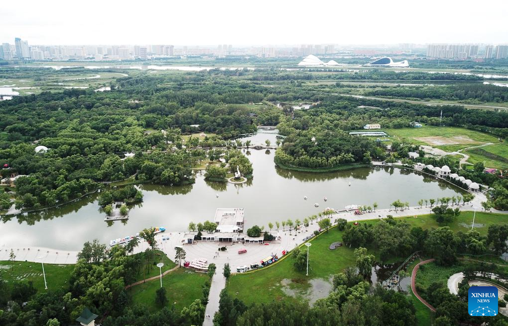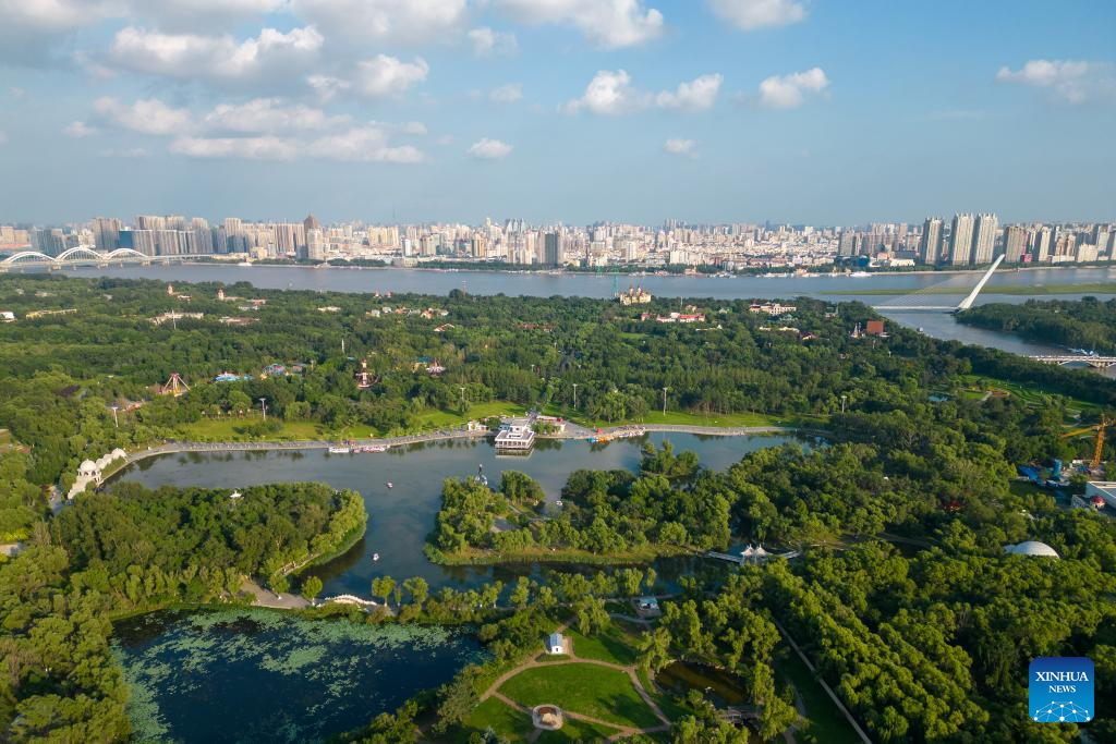 This aerial photo taken on July 31, 2023 shows a view of Sun Island scenic spot in Harbin, northeast China's Heilongjiang Province. Situated on the northern bank of the Songhua River in Harbin City, Sun Island scenic spot offers a multifunctional landscape that combines European-style architecture, rural scenery, folk culture, and ice and snow culture. (Xinhua/Wang Jianwei)