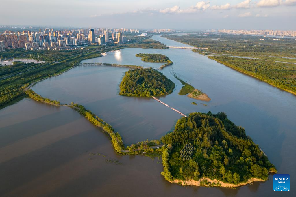 This aerial photo taken on July 31, 2023 shows a view of Sun Island scenic spot in Harbin, northeast China's Heilongjiang Province. Situated on the northern bank of the Songhua River in Harbin City, Sun Island scenic spot offers a multifunctional landscape that combines European-style architecture, rural scenery, folk culture, and ice and snow culture. (Xinhua/Zhang Tao)