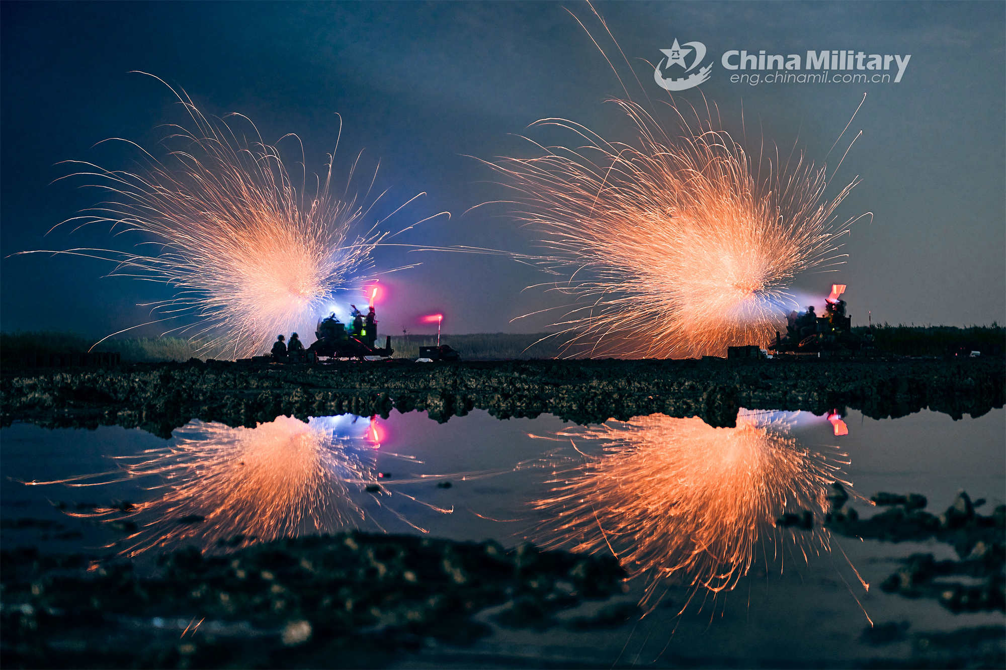 A battery of anti-aircraft guns attached to an air defense brigade under the PLA 73rd Group Army opens fire at mock target. Recently, the brigade organized a live-fire air-defense exercise to strengthen the troop's combat capability. (eng.chinamil.com.cn/Photo by Zhang Jie)