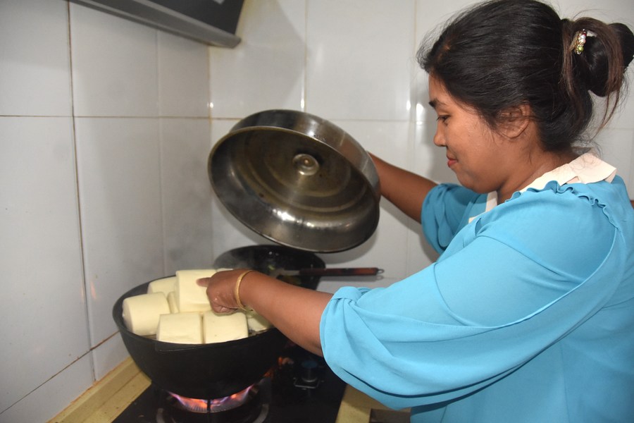 Local resident Bahargul Qadir cooks with natural gas at home in Hotan City of Hotan Prefecture, northwest China's Xinjiang Uygur Autonomous Region, Aug. 15, 2023. (Xinhua/Gou Lifeng)
