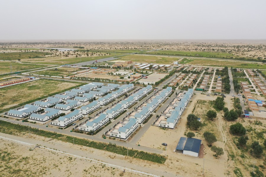 This aerial photo taken on Aug. 13, 2023 shows the relocated Darya Boyi Village in northwest China's Xinjiang Uygur Autonomous Region. (Xinhua/Su Chuanyi)