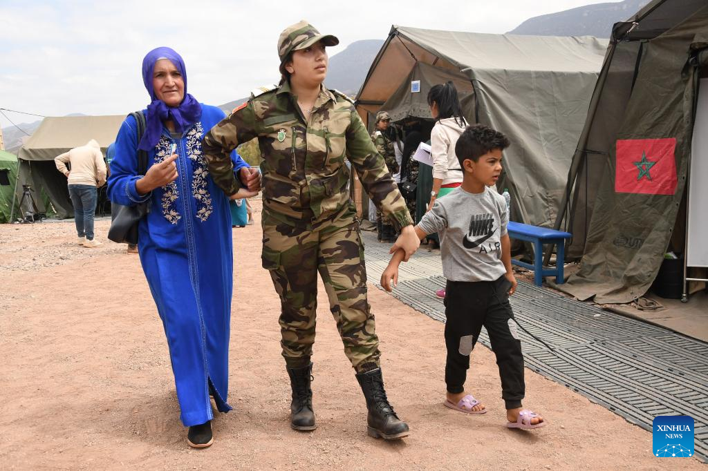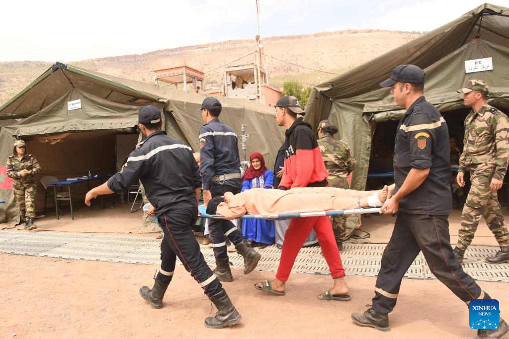 A rescue staff member guides victims at a temporary hospital specially installed for the earthquake in Al Haouz Province, Morocco, Sept. 12, 2023. By Monday evening, the earthquake had killed 2,862 people and injured at least 2,562 in Morocco, according to the latest update from the Interior Ministry. (Photo by Saouri Aissa/Xinhua)