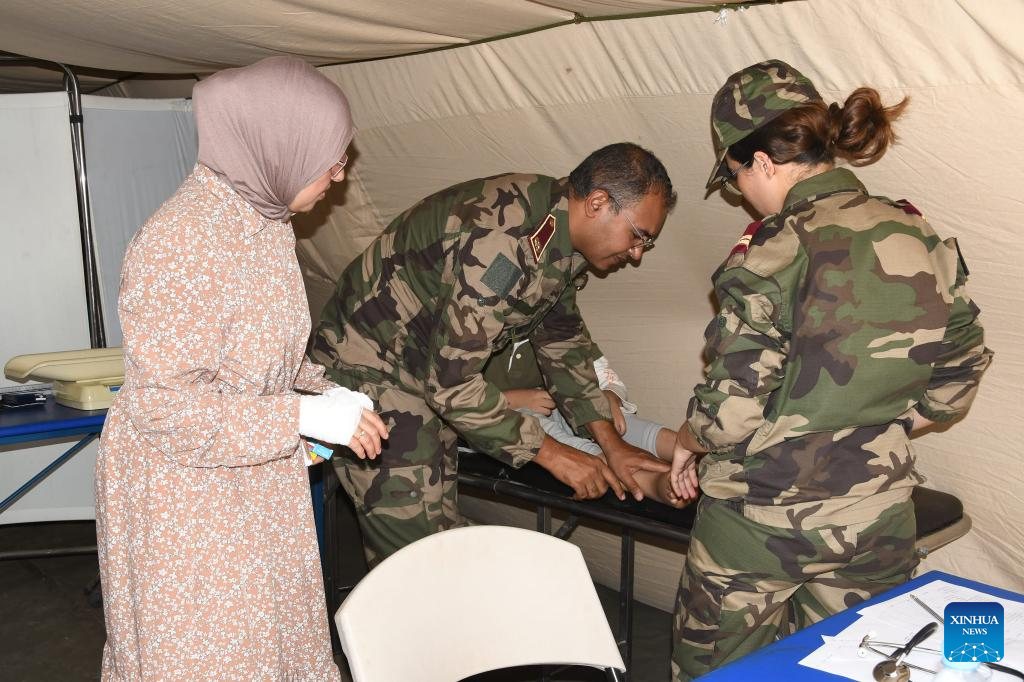 Rescue staff treat a victim at a temporary hospital specially installed for the earthquake in Al Haouz Province, Morocco, Sept. 12, 2023. By Monday evening, the earthquake had killed 2,862 people and injured at least 2,562 in Morocco, according to the latest update from the Interior Ministry. (Photo by Saouri Aissa/Xinhua)