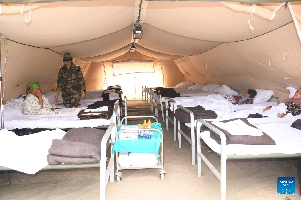 A temporary hospital specially installed for the earthquake is seen in Al Haouz Province, Morocco, Sept. 12, 2023. By Monday evening, the earthquake had killed 2,862 people and injured at least 2,562 in Morocco, according to the latest update from the Interior Ministry. (Photo by Saouri Aissa/Xinhua)