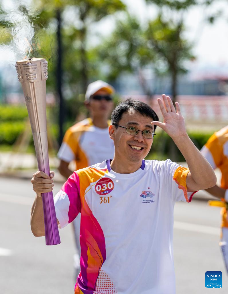 Torch bearer Su Maohui runs with the torch during the torch relay of the 19th Asian Games in Zhoushan, east China's Zhejiang Province, Sept. 13, 2023. (Xinhua/Sun Fei)