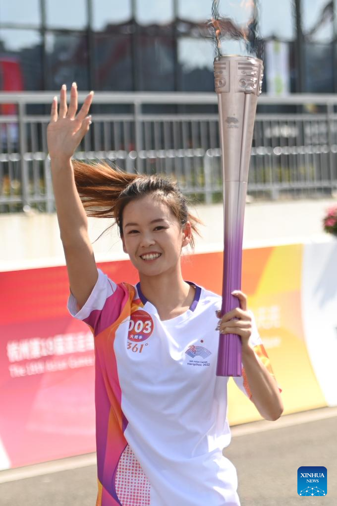 Torch bearer Lin Jing runs with the torch during the torch relay of the 19th Asian Games in Zhoushan, east China's Zhejiang Province, Sept. 13, 2023. (Xinhua/Sun Fei)