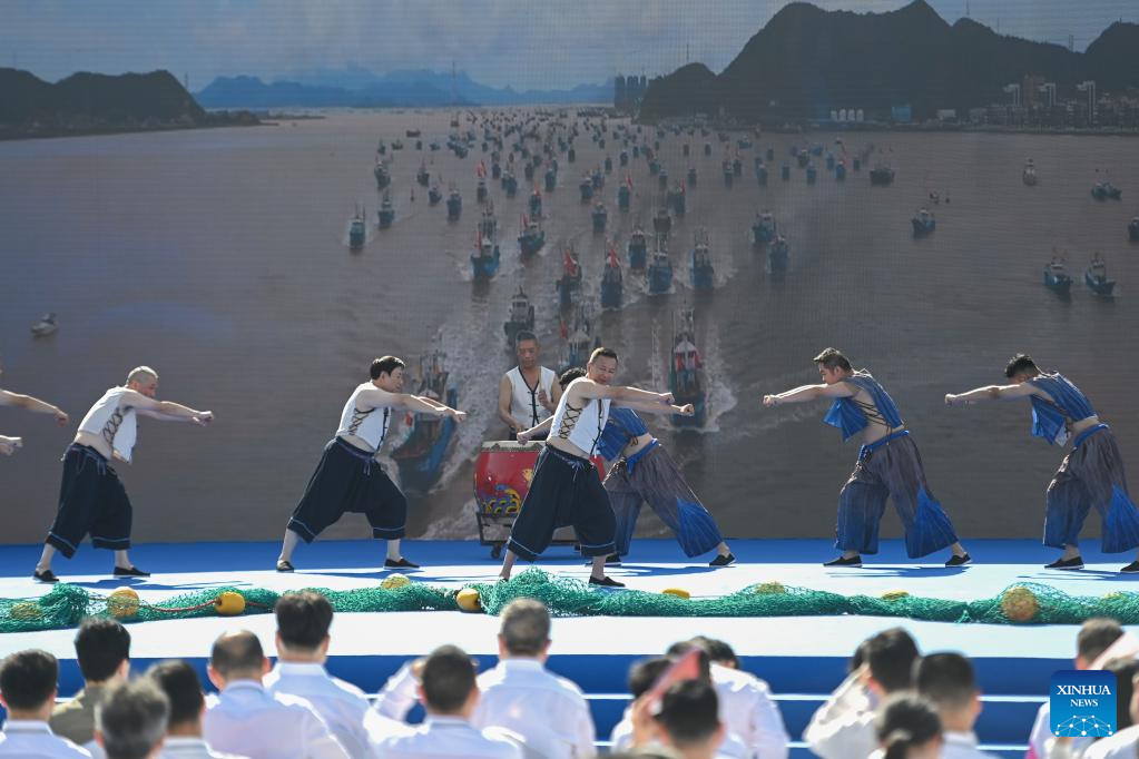 Actors and actresses perform during the starting ceremony of the torch relay of the 19th Asian Games in Zhoushan, east China's Zhejiang Province, Sept. 13, 2023. (Xinhua/Huang Zongzhi)